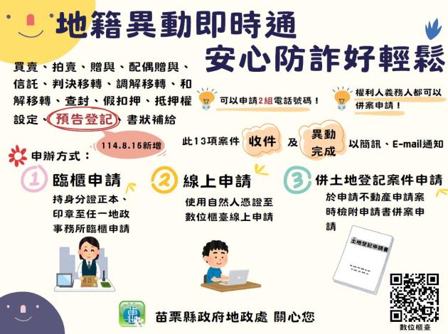 鑒於近期不動產抵押設定詐騙案件頻傳,且高風險抵押權設定案件多與預告登記或信託登記連件辦理,為強化防範高風險不動產詐騙,保障民眾財產安全,自114年8月15日起,地籍異動即時通服務通知範圍新增「預告登記」之登記原因。