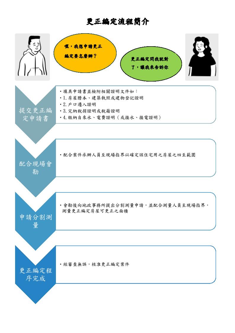 在編定公告之前,已經符合「製定非都市土地使用分區圖及編定各種使用地作業須知」編定規定,因編定錯誤或法令規定可以改編編定者,應辦理更正編定。非都市土地使用編定後辦理更正編定的土地,由土地所有權人提出編定前已符合「製定非都市土地使用分區圖及編定各種使用地作業須知」編定規定,且現在仍係屬有效的證明文件,就近向土地所在地縣(市)政府或地政事務所申請辦理更正編定。